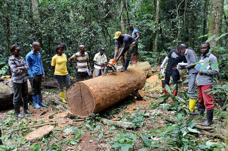 Artisanal logger demonstrates to students of the University of Kisangani that sustainable forest management is possible when the right logging techniques are adopted.