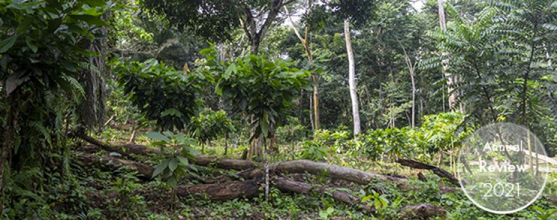 Although the coming of the Yira has led to tensions with the original population and has increased the pressure on the forest, it has also provided new opportunities. Tropenbos DR Congo realized that the original population could learn from the Yira about sustainable agriculture, and could benefit from the increasing market for cocoa. The challenge, however, was to prevent the adoption of cocoa cultivation from leading to further deforestation. Tropenbos DR Congo therefore started helping farmers with establishing mixed agroforestry systems (combining cocoa with other useful species such as fruit trees, and trees that function as hosts for edible caterpillars) on the condition that these farms were established on previously deforested lands within community forest concessions.