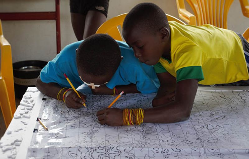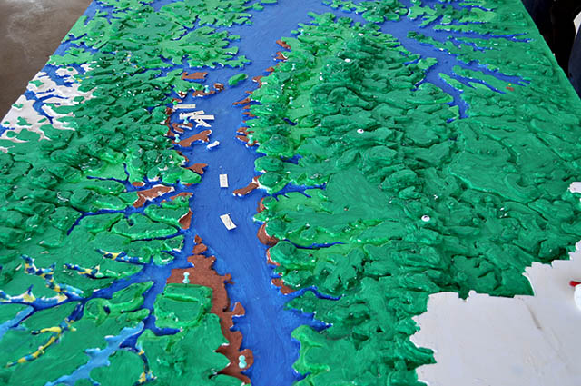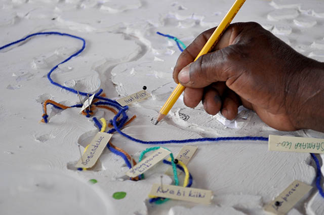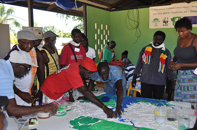 A three-dimensional map of the upper Suriname River has been developed through participatory mapping by local communities of the Saramaccan ethnic group in Suriname. Children, women, men and elders worked together during 10 days to build the map that represents their territory in 34 aspects relevant for their orientation, livelihoods and culture.